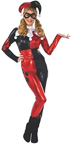 - Deluxe officially licensed DC Comics Harley Quinn costume jumpsuit, mask, hat, and waist cincher in reusable garment bag