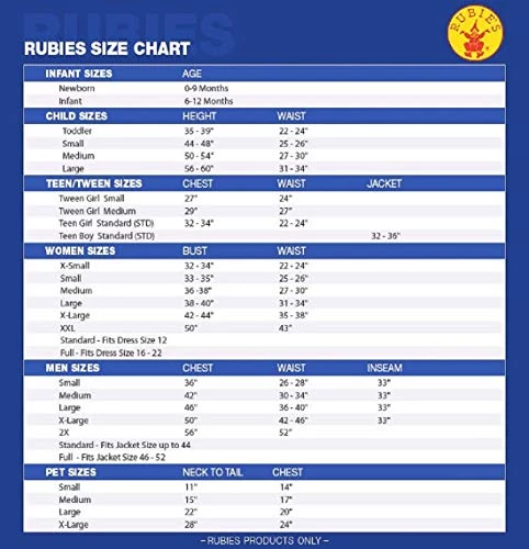 - Adult Size Mens Standard (50) 50″ chest – 42-46″ waist – 33″ inseam – 5’9″ – 5’11” approx 180-210lbs. Rubies adult men’s costumes are generally loose cut to fit range of stated sizes