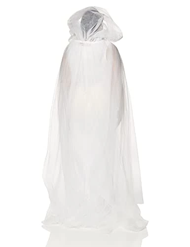 This is quite long. I am 5′ 5′ and it drags a lot. Which looks cool. The net is in 3 pieces – back, front left and front right. As you walk, it doesn’t stay in front like in the photo. The two narrow bits in the front don’t stay put. We fixed this with a couple tiny knots of white thread. (You can use safety pins too) I would also bobby pin the hood to the top of the head. It is totally see-through. You need a white dress underneath.If the cape is to long (like you will walk a lot) then it is netting so you can just cut it, no hem needed.