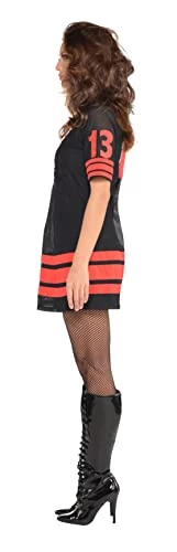 Ch ch ch, ah ah ah! Haunt them like the famous antagonist from Camp Crystal Lake in this Miss Voorhees Halloween Costume, inspired by the Friday the 13th film series. This adult outfit is one piece, making it easy to get ready! This black hockey jersey dress has red stripes, “Jason Voorhees” and the number 13 printed on the back. The front features the iconic hockey mask in a printed bloody setting. The dress has an attached slip. Medium fits dress size 6-8 for women up to 5’8” tall, chest 37”, waist 28 1/2” and hips 39”. Add a hockey mask and prop machete to complete your look (sold separately). Perfect for trick or treating, birthday parties, cosplay, Halloween carnivals, and more. 100% polyester. To clean, remove all accessories, hand wash cold and line dry. Intended for adult use only. Shoes, tights, and weapons not included. Officially licensed Warner Brothers Friday the 13th Costume.