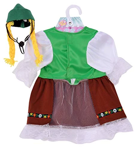 - Pet costume features fraulein dirndl-style dress; dress has white sleeves and attached apron, green bodice with red ribbon for a corset look