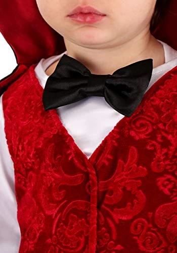 Just Take Our Blood Already! There’s a level of cuteness that makes us simply hand over anything we might have that holds value. Like if a shar-pei held us up at the ATM we’d probably hand over the cash and call him a good boy. And if we watched a lemur hop into our car, hotwire the engine and take off into the sunset, we wouldn’t call the police. We’d need our phone to capture that adorable phenomenon on camera. So when it comes to an adorable baby vampire, our defenses are down. There’s no way we wouldn’t allow a Little Vlad into our house when he showed up at the window pane. We wouldn’t be able to smear ourselves with garlic or pile on our silver jewelry. That blood-sucking baby would get what he wanted! Products Details Your baby will be perfectly on-theme for his first Halloween! Little Vlad will stay perfectly comfortable in super-soft fabric. The cape is attached to the red swirling patterned vest with a hook and eye touch strip. The shiny blouse underneath the vest will make your little one look perfectly at home in a crooked castle in Romania. We wouldn’t even be surprised if you slipped the soft trousers on your child outside of Halloween.  Child of the Night Are you ready for your little one’s first Halloween? It’s a great idea to go the traditional route. You’ll treasure how timeless your child looks in those posed pictures with spider webs and pumpkins props. The whole family can dress up together. We think mom and dad would look quite chilling in one of the vampire costumes from our vast selection. Just make sure your little one is well fed. After all, we think that Little Vlad is still kind of young to start drinking blood.  – Top – Pants – Cape