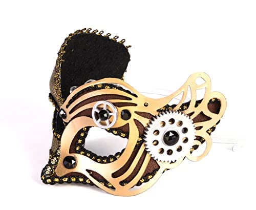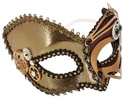 - Adult steampunk half mask with eyeglass arms is metallic gold with a decorative gold panel covering one half and adorned with gold and silver gears