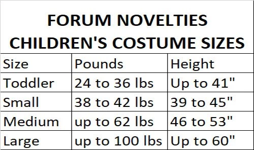 - IMPORTANT! Costumes are sized differently than apparel and vary between brands, consult the FORUM NOVELTIES CHILD SIZE CHART image before selecting size