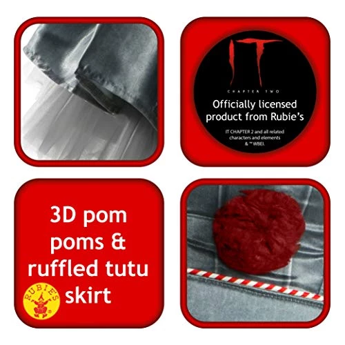 Transform into the psychotic evil clown that haunts the dreams of many in this officially licensed deluxe Pennywise costume set. Features a Pennywise themed sleeveless top with attached red pom poms; ruffled neck collar; metallic puffed skirt, and printed boot tops. Costume wig available separately. Haunt the members of the loser’s club and the rest of the town of Derry, Maine in this deluxe costume and look good while you’re at it! Includes top, skirt, collar and boot-covers; all other pieces shown sold separately. Great for anytime of the year; group dress up, movie nights, themed events, comic con, haunted houses, fun runs, movie premieres and of course Trick or Treat and Halloween too! Rubie’s brings fun and fantasy to dress-up with the broadest selection of costumes and accessories, offering everything from full mascot suits to masks and wigs, from deluxe licensed costumes to simple starter pieces, from costume shoes to character make-up, and so much more. Family-owned, family-focused, and based in new York since 1951, Rubie’s promotes safety in dress-up so you can relax and have a great time while looking the part. Look to Rubie’s for every costume occasion and season.