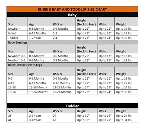 - READ BEFORE BUYING: Costumes are not sized the same as apparel, please review the Rubie’s INFANT/TODDLER SIZE CHART IN IMAGES, reviews and Q & A for best fit, do not choose based on clothing size