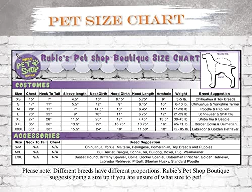 - READ THE RUBIE’S PET SIZE CHART and WATCH THE SIZING INSTRUCTION VIDEO, do not select size based on breed; consider costume style and animal shape before ordering