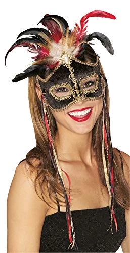 This mask fits well and is of good quality and construction. It has an attached headband that fits comfortably on your head. The head band allows you to position the mask as you like, so a person could even wear eyeglasses underneath the mask if they needed to. The one disappointment was that the red feathers weren’t as red as the photo. Mine were more of a brownish red.