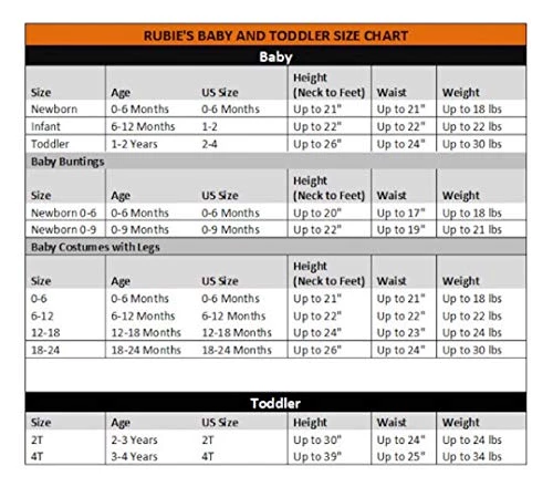 - Costume are not sized the same as apparel, consult Rubie’s Toddler Size Chart image before making selection